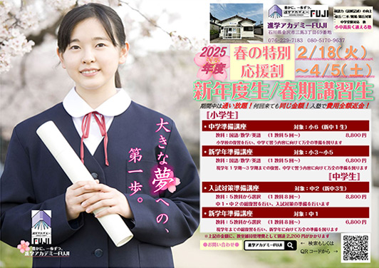 アーカイブ ARCHIVE HOME アーカイブ 点数アップ事例Grades 2024年度 2学期期末テスト 第1回金沢市統一テスト 第5回実力テスト 合格体験記Experience 2025年度 合格体験記「石川県立工業高校(電子情報科)合格」 2025年度 合格体験記「二水高校合格」 キャンペーンCampaign 2026年 春期講習 2025年 冬期講習 2025年10月 2025年 秋FUJI 2025年 秋FUJI 2025年 夏FUJI夏期講習 2025年 期末テスト集中講座 2025年 中間テスト特別応援割 2025年 新年度特別応援割 2025年 春の特別応援割 2025年 春の特別応援割 2024年 冬の学習応援キャンペーン 2024年 冬の学習応援キャンペーン SNS 今日もつぶやいてます 最新情報は、エックス、Instagramで BLOG ブログもやってます